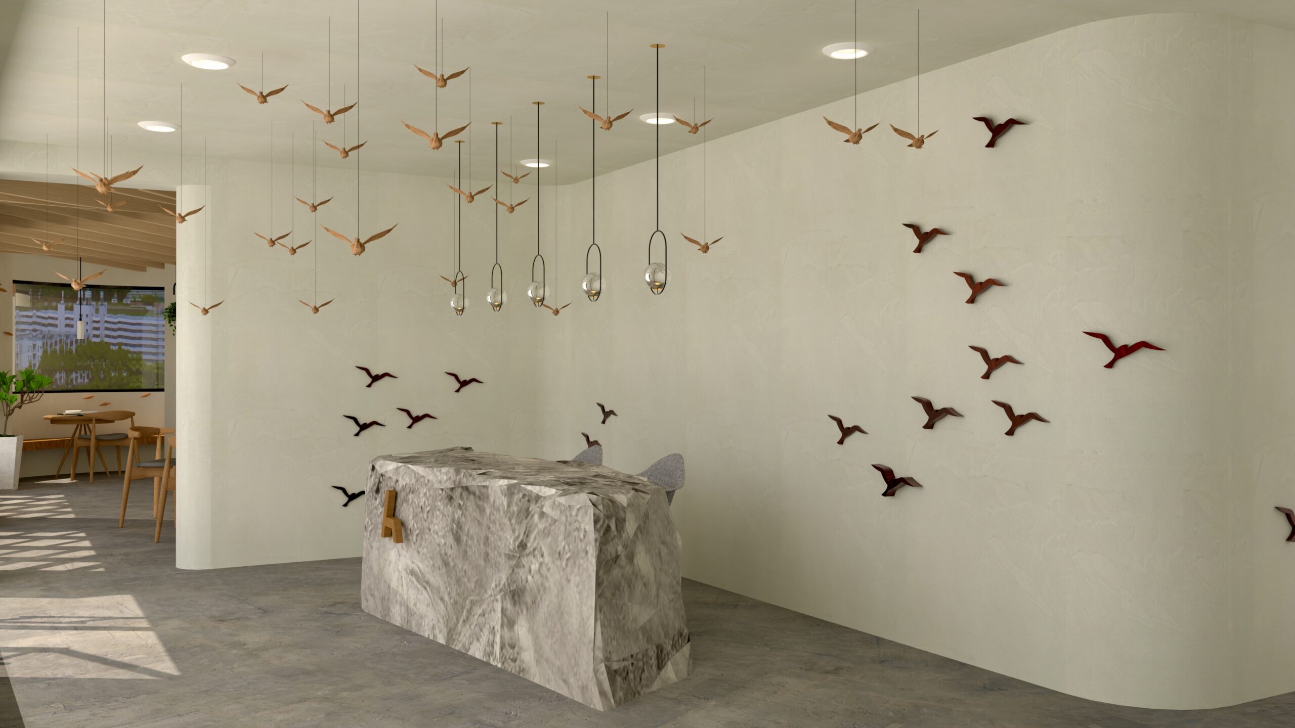 The design concept takes inspiration from the artwork of Derek Schapper, an artist with a keen interest in working with timber. Drawing from the observation of wildlife, the timber wall ornaments and artworks aim to convey a sense of sophistication and refinement. These pieces reflect the elegant and graceful results of Schapper's creative endeavours, infusing the hotel environment with a touch of natural beauty and artistry.