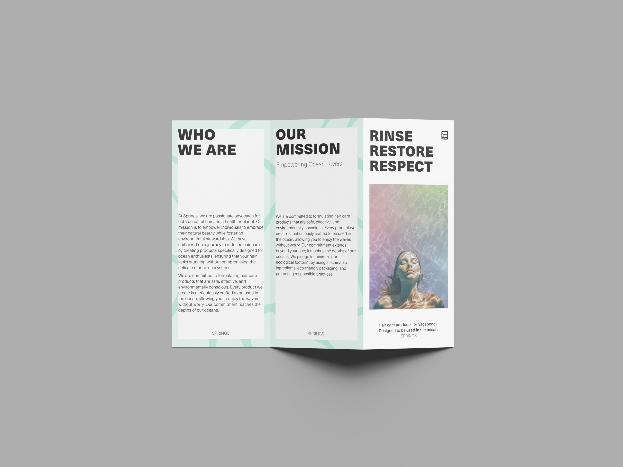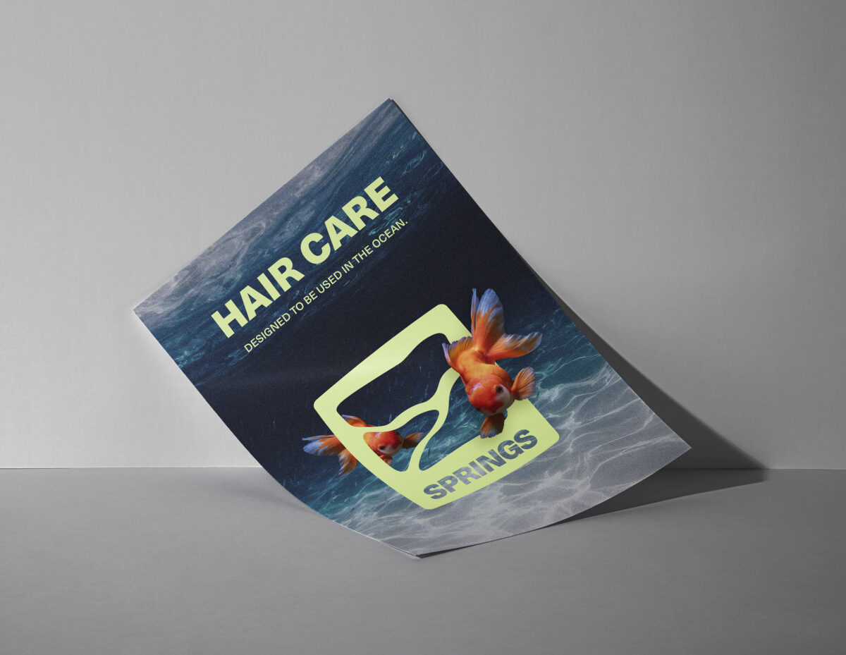 My concept for SPRINGS revolves around creating hair care products tailored for individuals with an adventurous and eco-conscious lifestyle. These products are specially designed to be used in marine environments, ensuring they dissolve seamlessly without harming the ecosystem. From the logo to the branding and campaign, this self-initiated project embodies my commitment to sustainability.