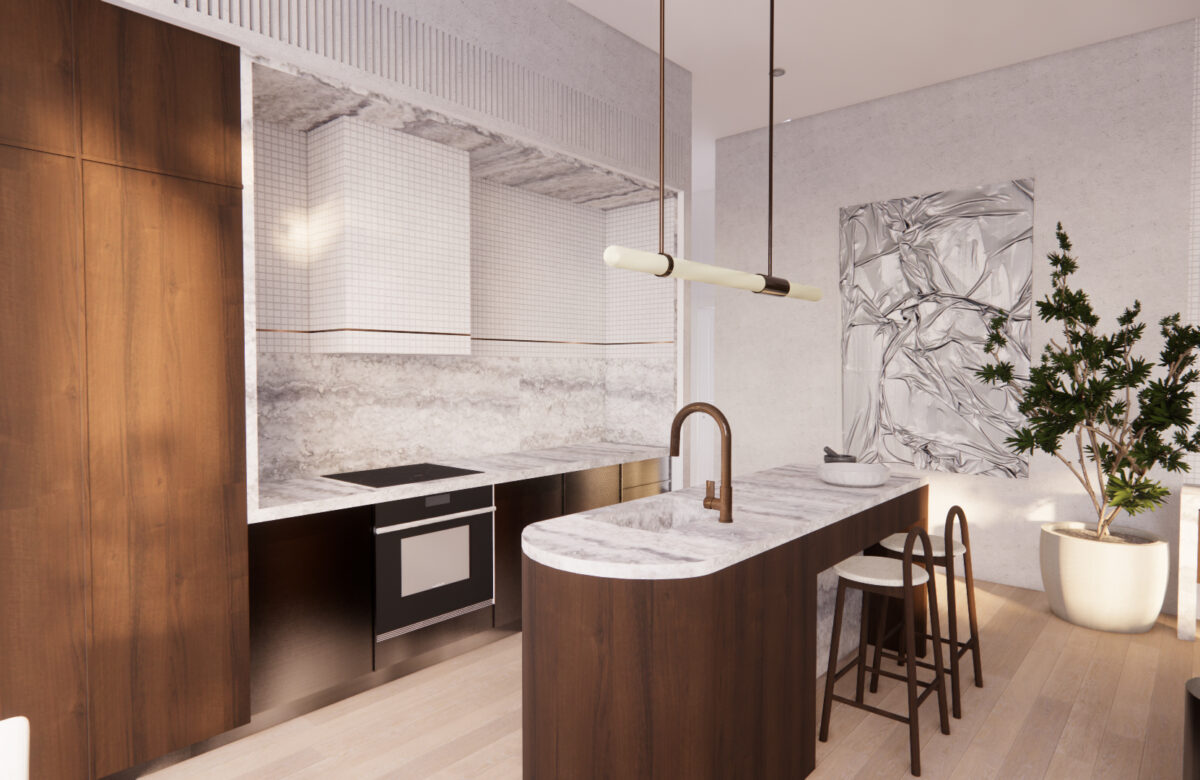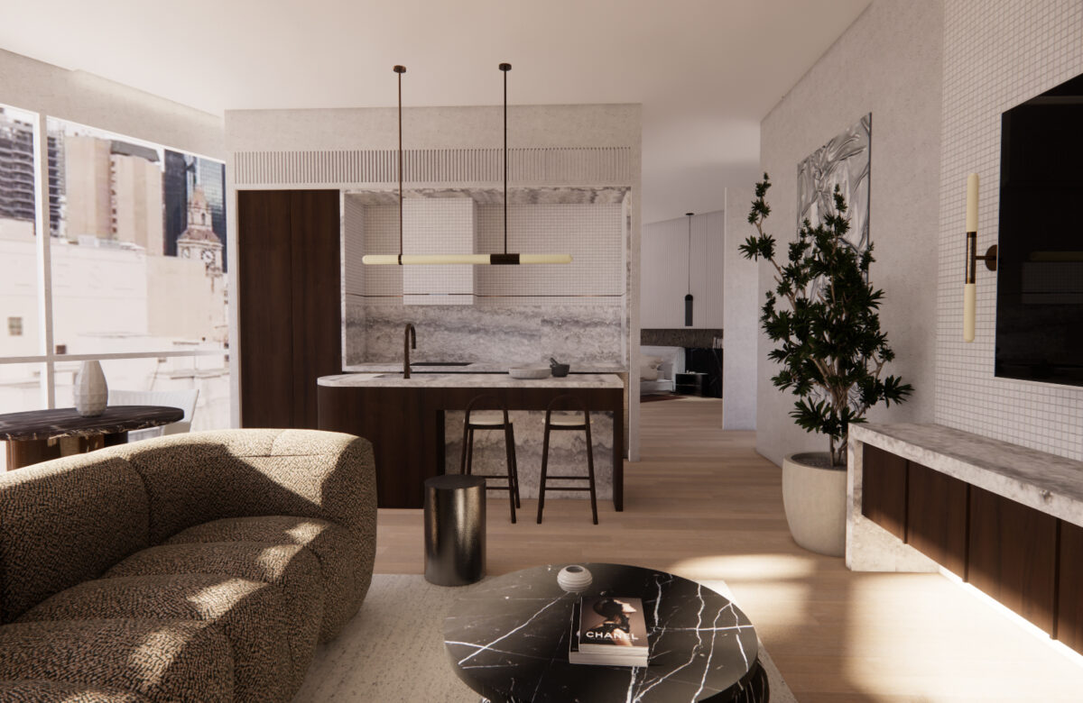 The Mnemosyne keyed back-to-back apartments have been thoughtfully designed to be used individually or as a collective. Fluted glass wall panelling has been acoustically double glazed and cascading floor length curtains are utilised to separate these spaces whilst retaining that important connection. These panels neatly tuck away contributing to a sleek and seamless aesthetic in order to open up and connect the adjoining apartments. The spaces have been designed with open-plan living in mind, facilitating seamless circulation suitable for entertaining, be it privately or between the two apartments.