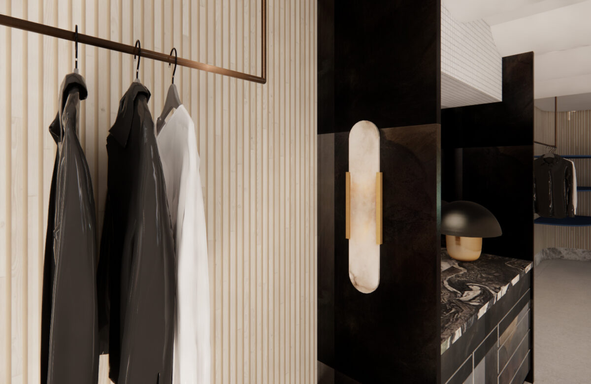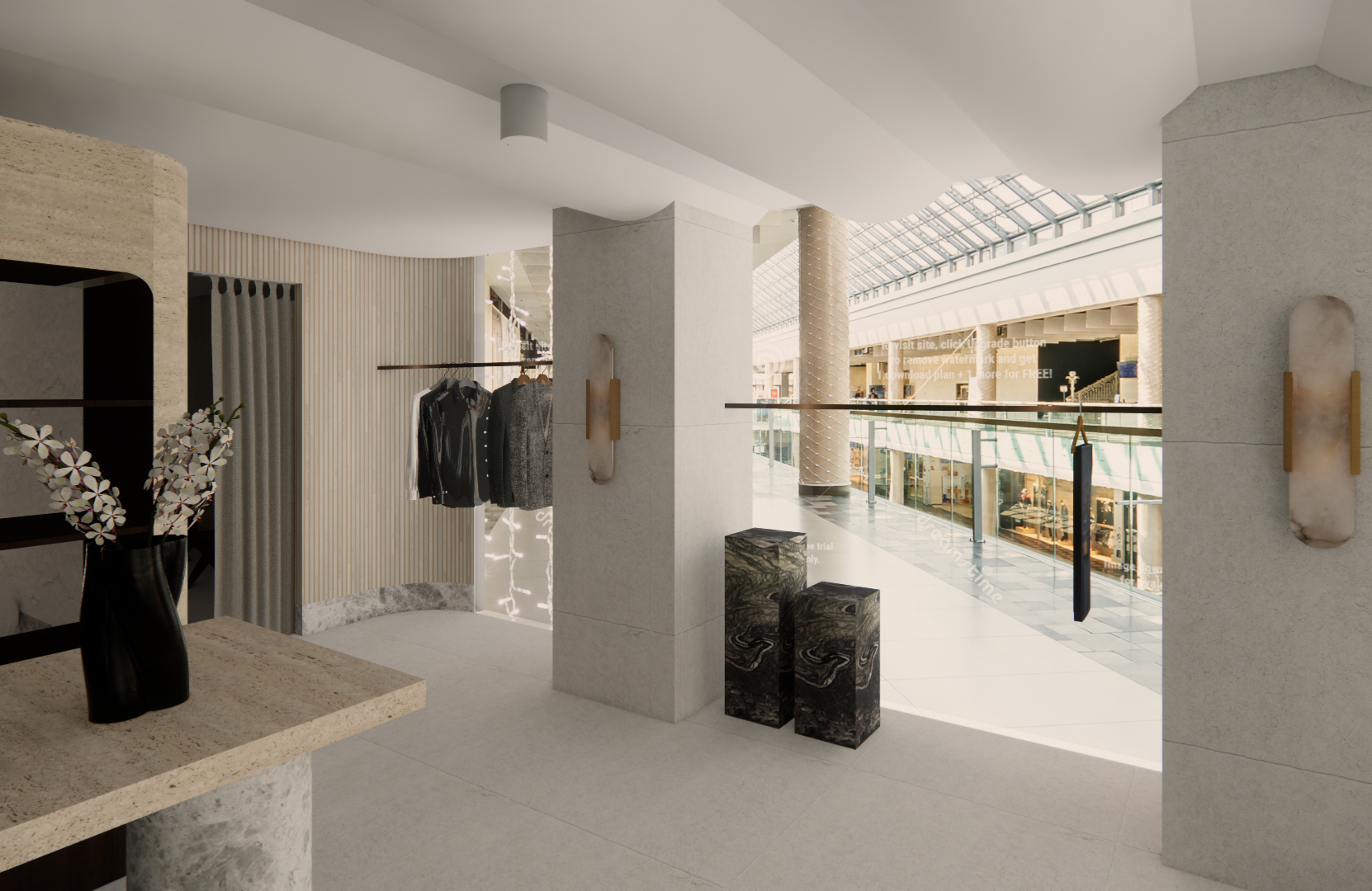 The overall design concept for Viktoria and Woods' Emporium retail space is a balanced combination of sophistication and edginess, aligning with the brand's minimalist and contemporary clothing range. The focus centers on creating a minimalist and contemporary space that effortlessly captures the consumer's attention as they move about the space.