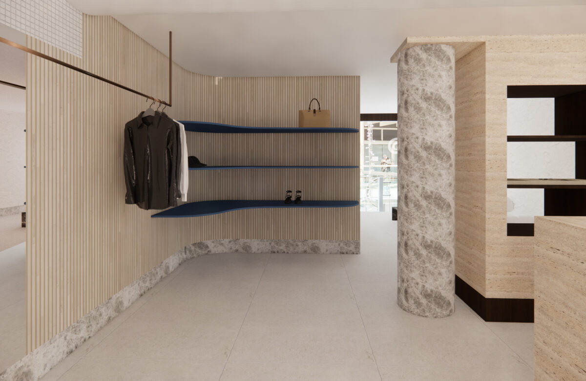 With a palette composed of meticulously selected premium materials, an elevated interpretation of the brand is achieved. Natural stone skirting boards and accent furniture add a timeless touch of elegance, while walnut, reclaimed timber incorporated into the store's POS counter brings warmth to the space. The blackened steel wall cabinetry provides a contemporary and textured element, adding a sense of modernity to the store.
