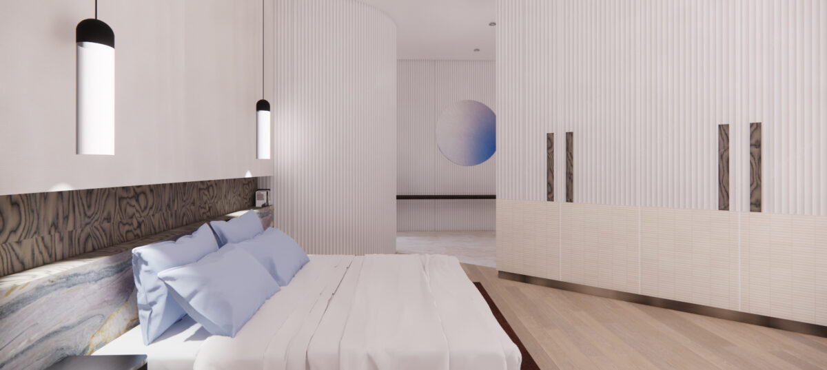 The spaces evoke a feeling of luxurious tranquility that provides visual stimulation without overwhelming the senses. An array of natural stone and marble was selected to symbolise luxury, influsing the space with interest through it’s inherent colours and veining. Light oak flooring and contrasting walnut timber cabinetry strike a harmonious balance. Dedar’s Amoir fabric with it’s distinctly random, pattern repeats gracefully adorns the walls, enhancing the overall ambience and sensory delight.