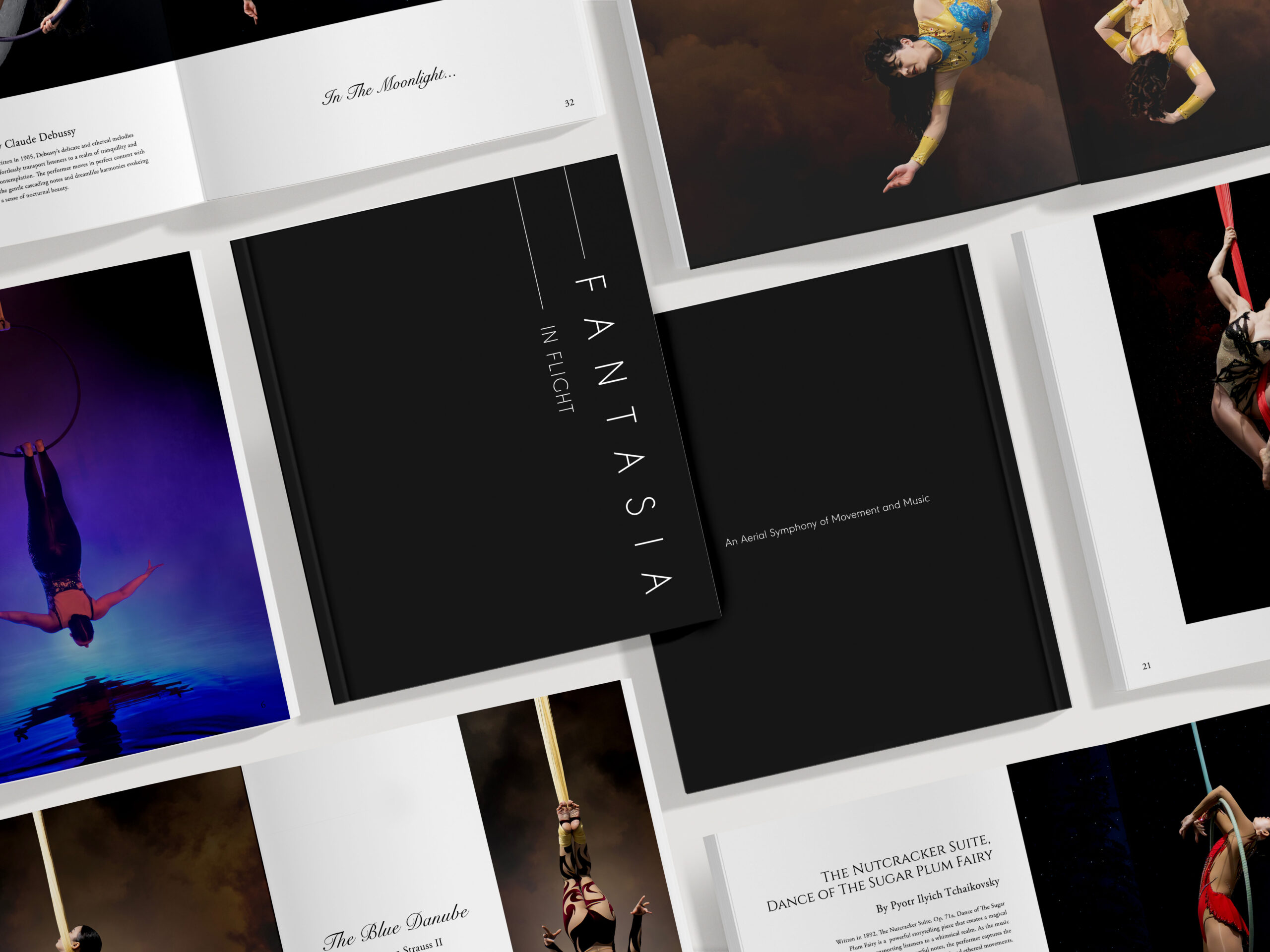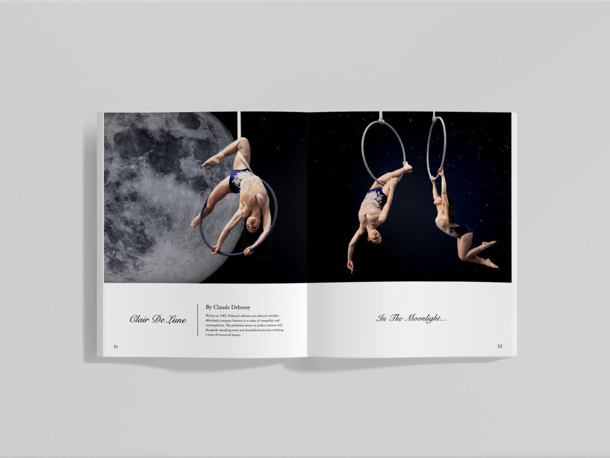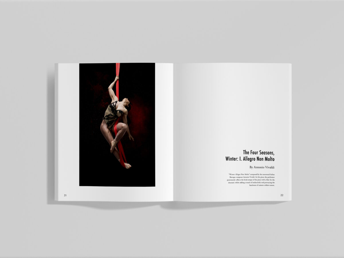 ‘Fantasia In Flight’ embraces the concept of ‘Fantasia’ where various performers are given the freedom to blend and reinterpret sound into a physical display of strength and grace. For this project, I developed the concept through blending my passion for Aerial Arts, photography, classical music, and layout design to create a physical exploration of music and its relationship to performance.