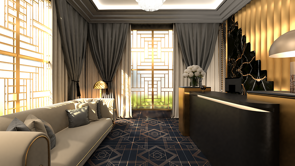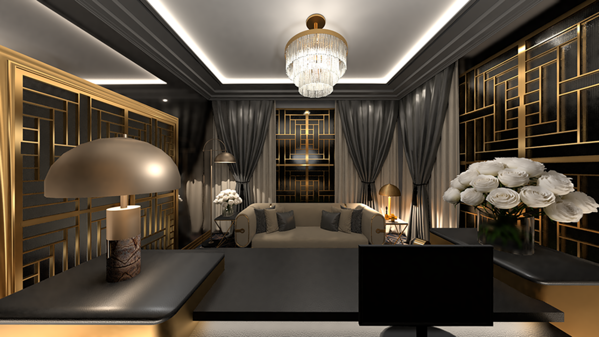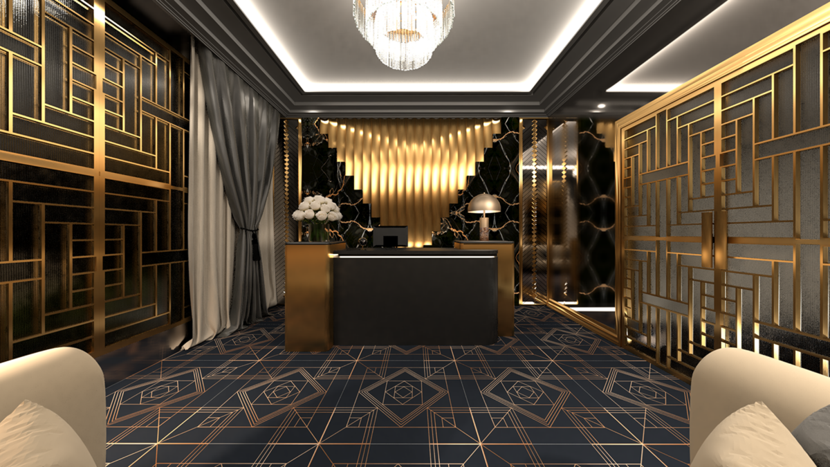Concept: Inspired by the opulence of the Art Deco Era, this project aims to fashion a reception area exuding luxury and glamour by using geometric metal-frame windows and showcasing intricate Art Deco patterns to convey the feeling of the Era. Curvilinear elements, a rich dark colour palette, and elegant materials like black marble wall tiles and metallic accents contribute to an ambience of sophistication. Dark grey silk curtains and contemporary lighting fixtures add texture and modernity to the space, which seamlessly blend the grandeur of the Art Deco Era with the demands of modern luxury.