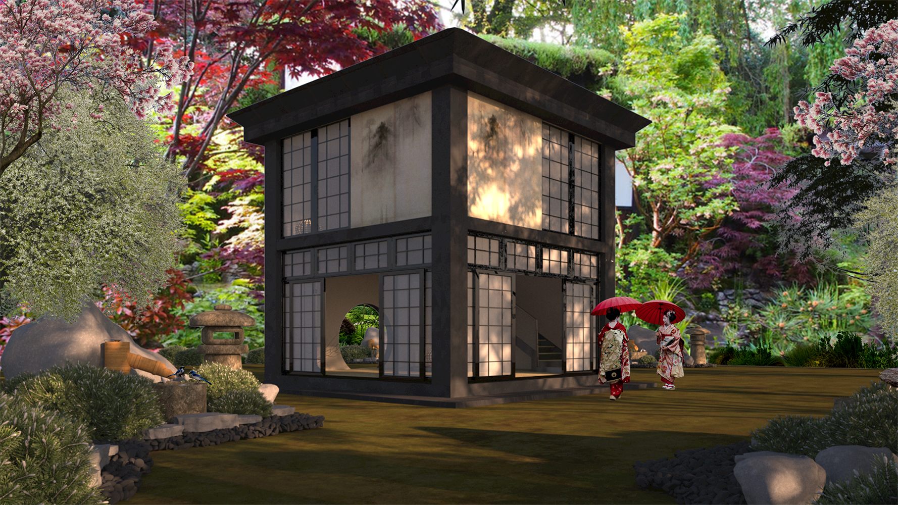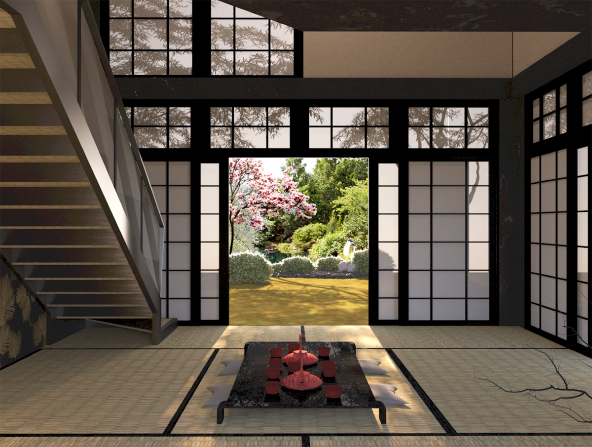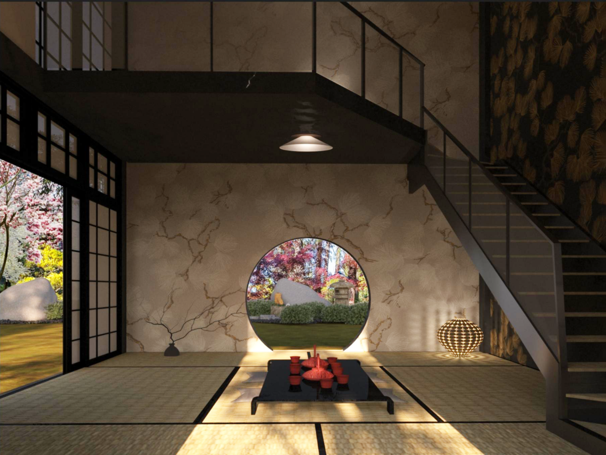 The design focuses on a Japanese tea house for tea ceremony gatherings.